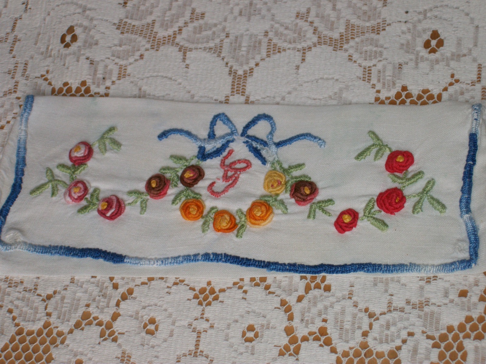 Sorry this item is soldThis is a holder for a napkin but you could use it for hankies, or stockings - it has a monogramme of 'G' and wonderfully worked roses in raised French knots - just lovely...
